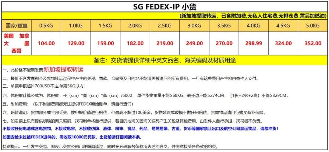 “美国、加拿大、墨西哥 SG FEDEX-IP 小货”运输